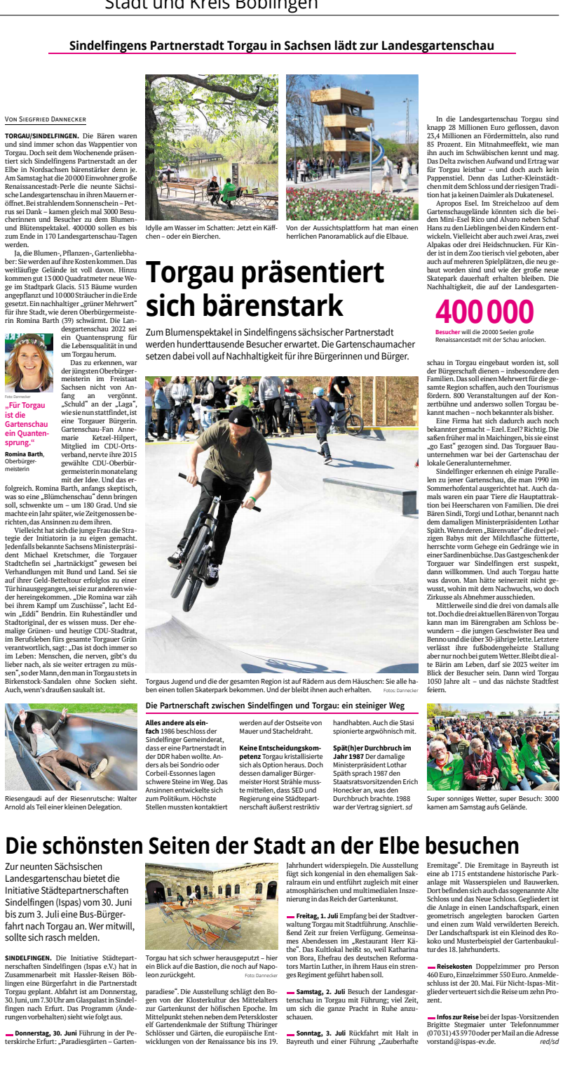 Die KREISZEITUNG Böblinger Bote veröffentlichte am 25.05.2022 folgenden Artikel zur Eröffnung der Landesgartenschau Sachsen in Torgau.
