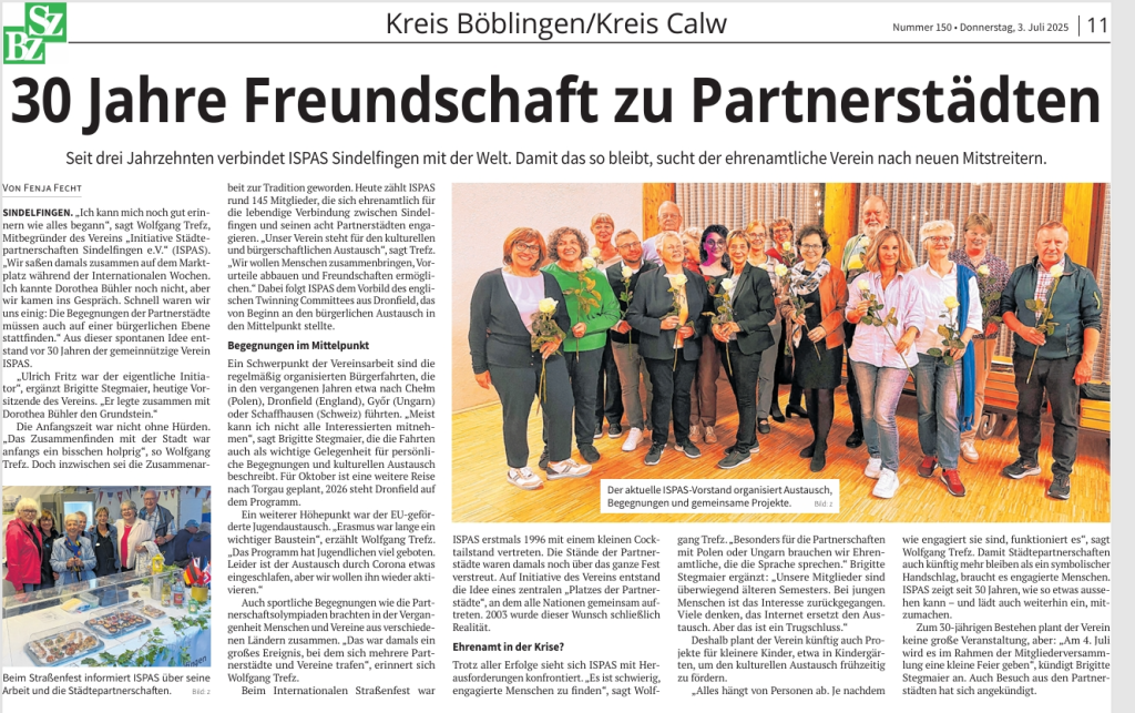 SZ/BZ Artikel über 30 Jahre ISPAS e.V. Ursula Steinhübl 27. Juli 202527. November 2025 0 Am 3. Juli 2025 wurde in der Sindelfinger Zeitung folgender Artikel von Fenja Fecht über unseren Verein veröffentlicht. szbz30JahreFreundschaftzuPartnerstädten