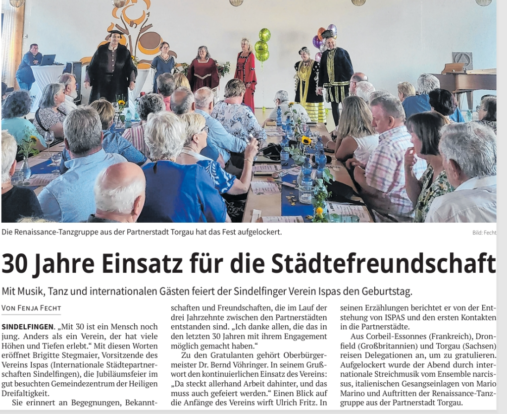 Am 11. Juli gab es in der Sindelfinger Zeitung einen Bericht über die Feier des Vereins ISPAS zu „30 Jahren Einsatz für die Städtefreundschaft“.